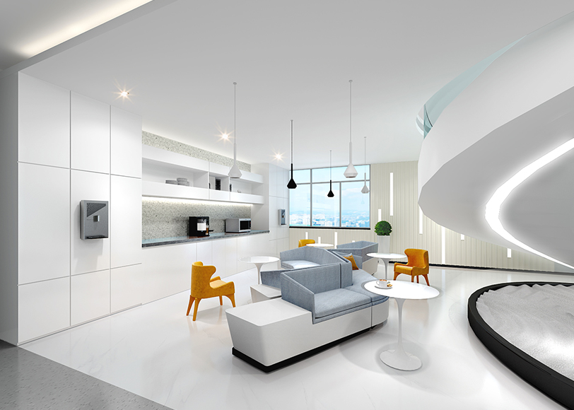 4、門廳接待處背景墻設(shè)計采用真實植物進行裝飾,構(gòu)成生態(tài)的室內(nèi)空間,提升空間使用的舒適度。辦公室前臺的設(shè)計運用體塊切割的方式做成不規(guī)則的形狀,以到達從不同的角度觀看到的場景都處于變化的狀態(tài)當(dāng)中。茶水區(qū),同時也是為員工準(zhǔn)備的小型餐廳,水泥質(zhì)感的休閑餐飲空間更加穩(wěn)重大方,吧臺的設(shè)計可為員工提供輕食的烹飪,以及簡食的加熱。