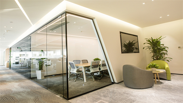 2、其次如何使玻璃隔斷和石膏板墻相結(jié)合,哪些墻面可以全部使用玻璃隔斷。這需要我們首先要了解玻璃隔斷的用法。一般來講,在辦公室裝修時,房間與房間之間的隔斷都會使用石膏板隔開,朝外的有門的一面墻則會使用玻璃隔斷和玻璃門。一方面方便辦公室內(nèi)的采光和延展空間,另一方面可以使空間相對于全部使用石膏板來講更為美觀。對于石膏板墻和玻璃如何結(jié)合這種情況,需要具體看辦公室裝修的需求和設(shè)計師的設(shè)計。例如互聯(lián)網(wǎng)公司和科技公司,有些墻面可以使用斜切墻面的方式使斜著的石膏板墻面與玻璃隔墻相結(jié)合與整體辦公室的裝修風(fēng)格相接近,也有一些相對獨立出來的圓形或異型房間則可以全部使用玻璃隔斷,不僅呼應(yīng)辦公室裝修的整體風(fēng)格也更為通透。