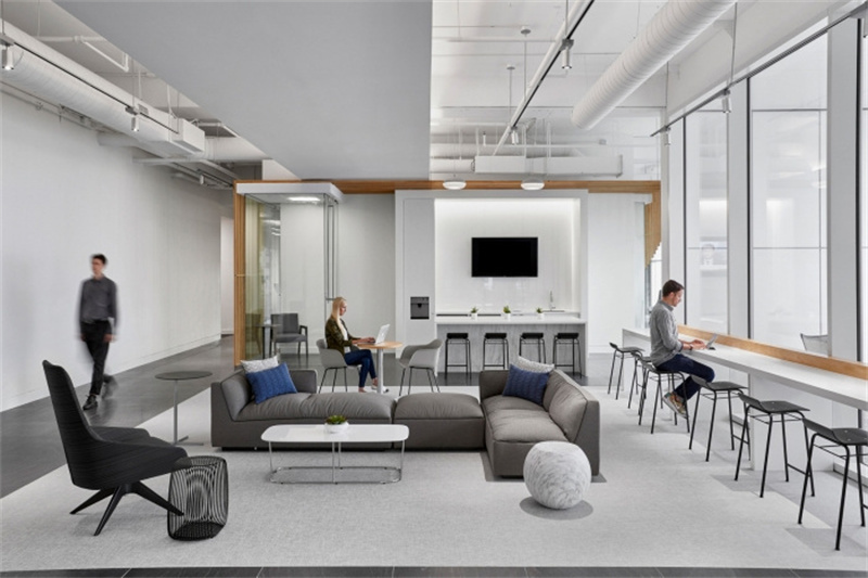 其次對(duì)于中大型的辦公室裝修,茶歇區(qū)或許更多是的是作為多功能的活動(dòng)區(qū)、辦公區(qū)使用。那么在考慮完其他的空間利用之后,茶歇區(qū)則可以結(jié)合空間里的柱子,窗邊等做一些活動(dòng)辦公桌、吧臺(tái)、卡座等以便于空間利用。如果辦公室空間很大,需要單獨(dú)設(shè)置一些茶水區(qū)使用,那么就可以對(duì)于空間里的‘卡槽’區(qū)域進(jìn)行鑲嵌使用,如果沒(méi)有這些區(qū)域也可以如上所述將一些獨(dú)立辦公房間墻壁向內(nèi)推進(jìn)一部分,留出茶水柜位置作為茶水區(qū)使用。
