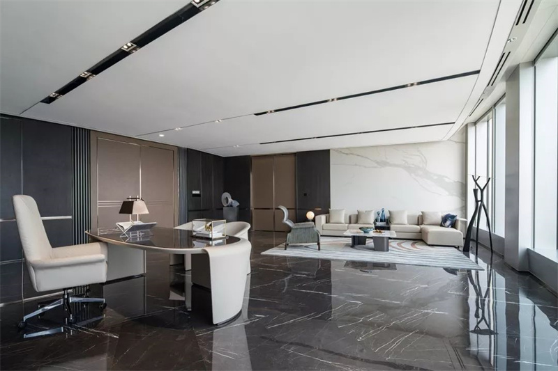 對(duì)于辦公室吊頂?shù)脑O(shè)計(jì)理念,往往設(shè)計(jì)為部分層疊吊頂和部分吊頂?shù)蹴?。這種造型設(shè)計(jì)方法是將部分管線、工程建筑梁或照明燈做成造型吊頂,而保留其他部分的原工程建筑吊頂多用于樓層較低但相對(duì)規(guī)整的工程建筑梁的室內(nèi)空間,因?yàn)閷?duì)布線管線進(jìn)行合理有效的裝飾后,仍能最大限度地利用原工程建筑的高度。這種吊頂造型不僅要注意造型吊頂與原工程建筑吊頂?shù)暮椭C關(guān)系,還要注意吊頂、地面與建筑立面的關(guān)系。