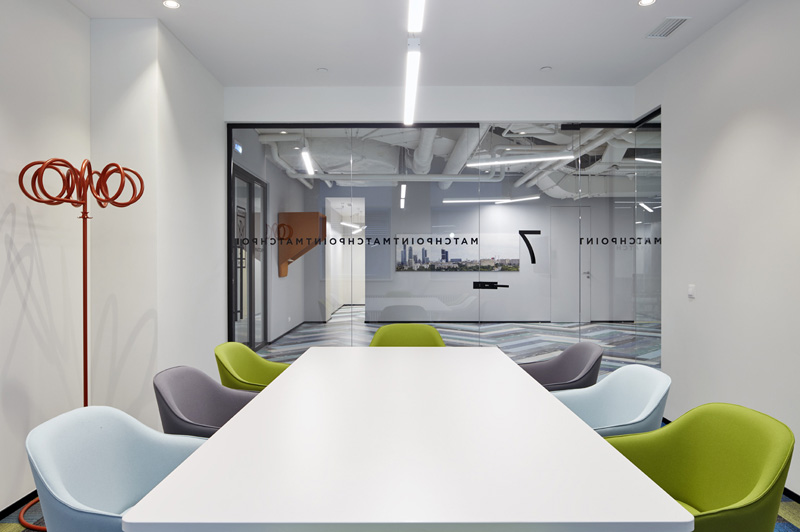 因為1200平米的辦公空間有限,所以部分區(qū)域用隔音玻璃做隔斷,既能阻隔空間,又能讓每個空間都有自己的私密性。在設計會議室的時候,布局要簡單一些,讓更好的創(chuàng)意在舒適的空間里發(fā)揮出來,提高工作效率。